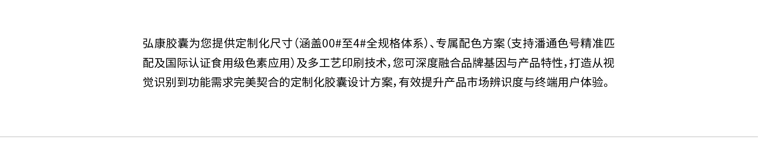 弘康胶囊为您提供定制化尺寸(涵盖00#至4#全规格体系)、专属配色方案(支持潘通色号精准匹配及国际认证食用级色素应用)及多工艺印刷技术,您可深度融合品牌基因与产品特性,打造从视觉识别到功能需求完美契合的定制化胶囊设计方案,有效提升产品市场辨识度与终端用户体验。