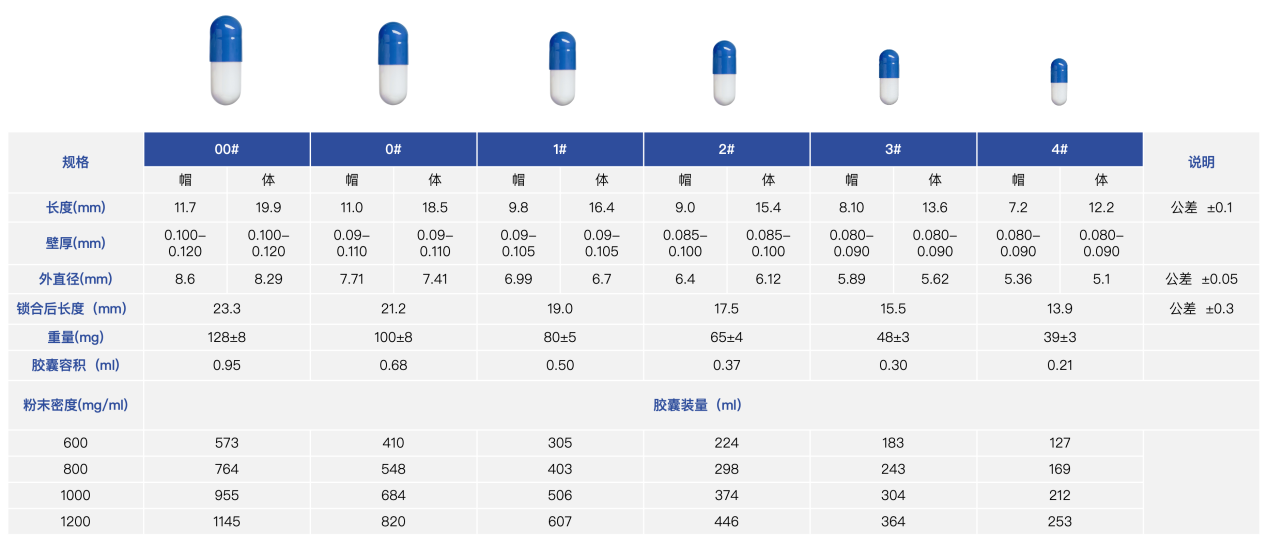 在选择适合您配方的胶囊时,胶囊尺寸图表是最直接有效的工具。无论您是在生产药品、营养补充剂还是保健品,了解胶囊的尺寸将有助于您选择合适的型号。胶囊能够容纳的粉末、液体或填充物的量取决于其尺寸,这直接影响其在输送活性成分方面的效果以及在治疗疾病方面的有效性。例如,尺寸最大的00号胶囊容量大,但可能难以吞咽;而尺寸最小的5号胶囊更容易吞咽,但容量有限。所以,为了确保您的配方既有效又安全,且符合所需的标准,就需要通过使用这份图表来避免过量填充或不足填充,以确保精确的剂量和保持产品的高质量。可见熟悉胶囊尺寸图表不仅有益,而且是必不可少的。